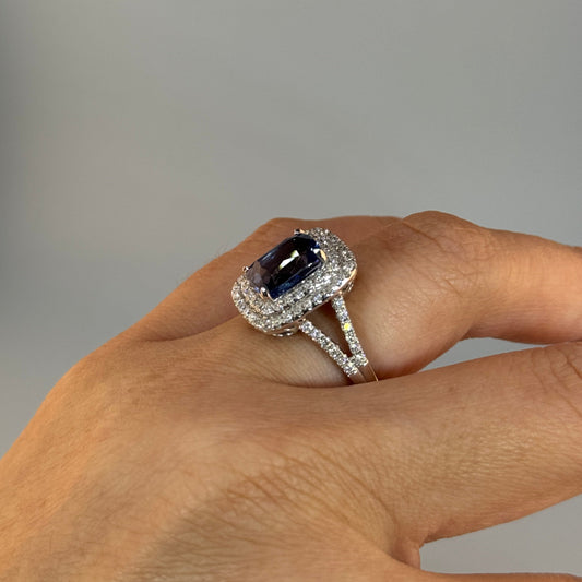 18KT Gold Halo Ring set with Blue Sapphire center stone and Diamonds