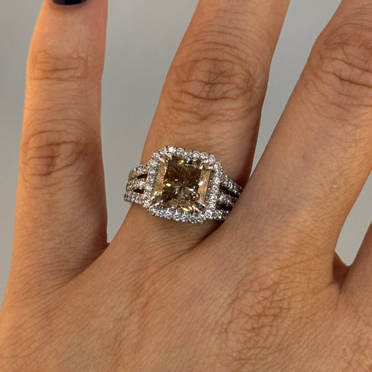 14KT Gold Halo Radiant Cut Brown Diamond Center Stone and White Diamonds Ring