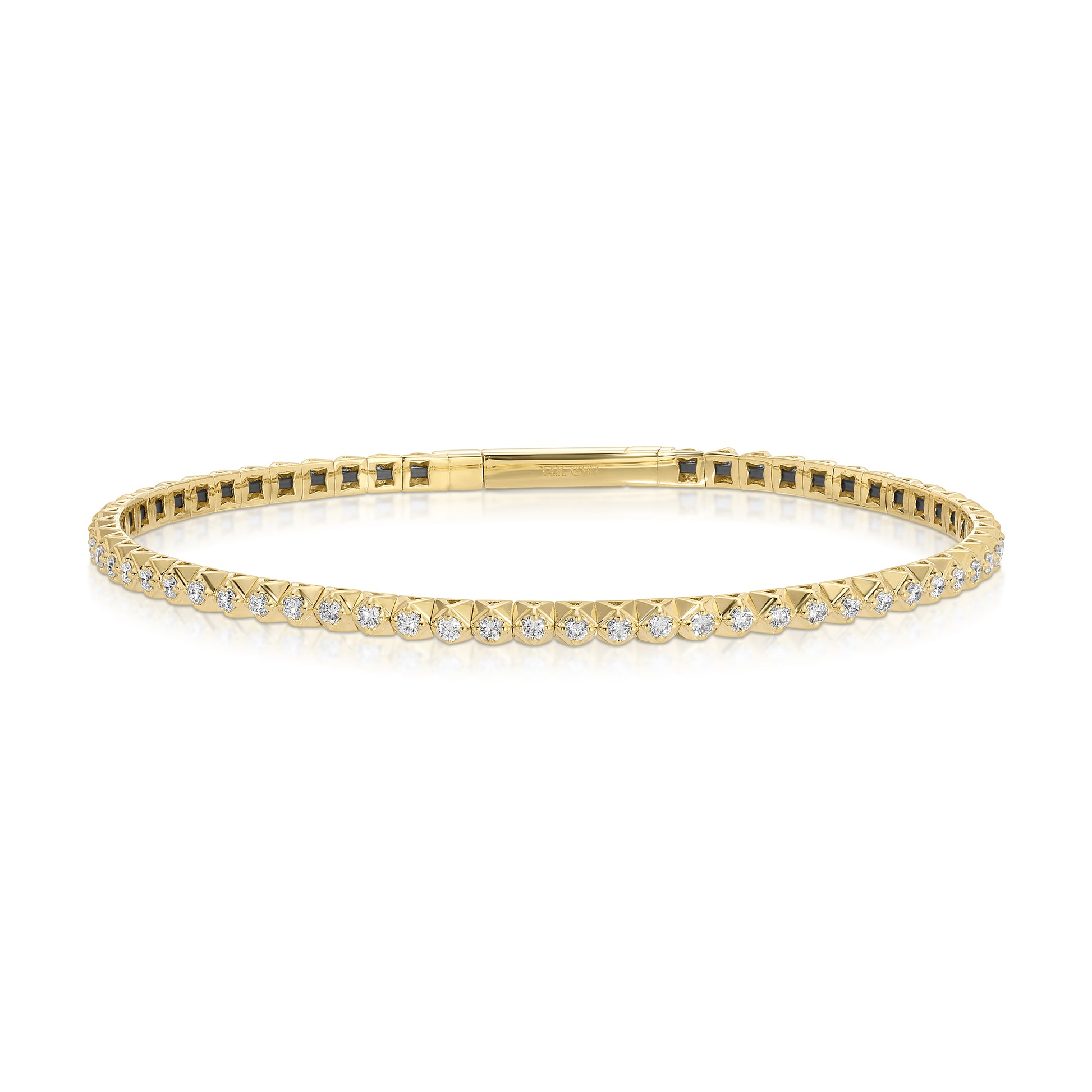 This beautiful 14K gold bangle is delicately adorned with .85ct of sparkling lab diamonds. Enhance any outfit with its timeless and elegant design. Perfect for any occasion, this bangle is sure to make a statement. This bangle weighs 6.2 grams.