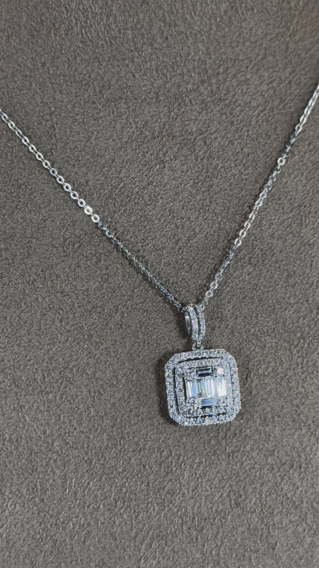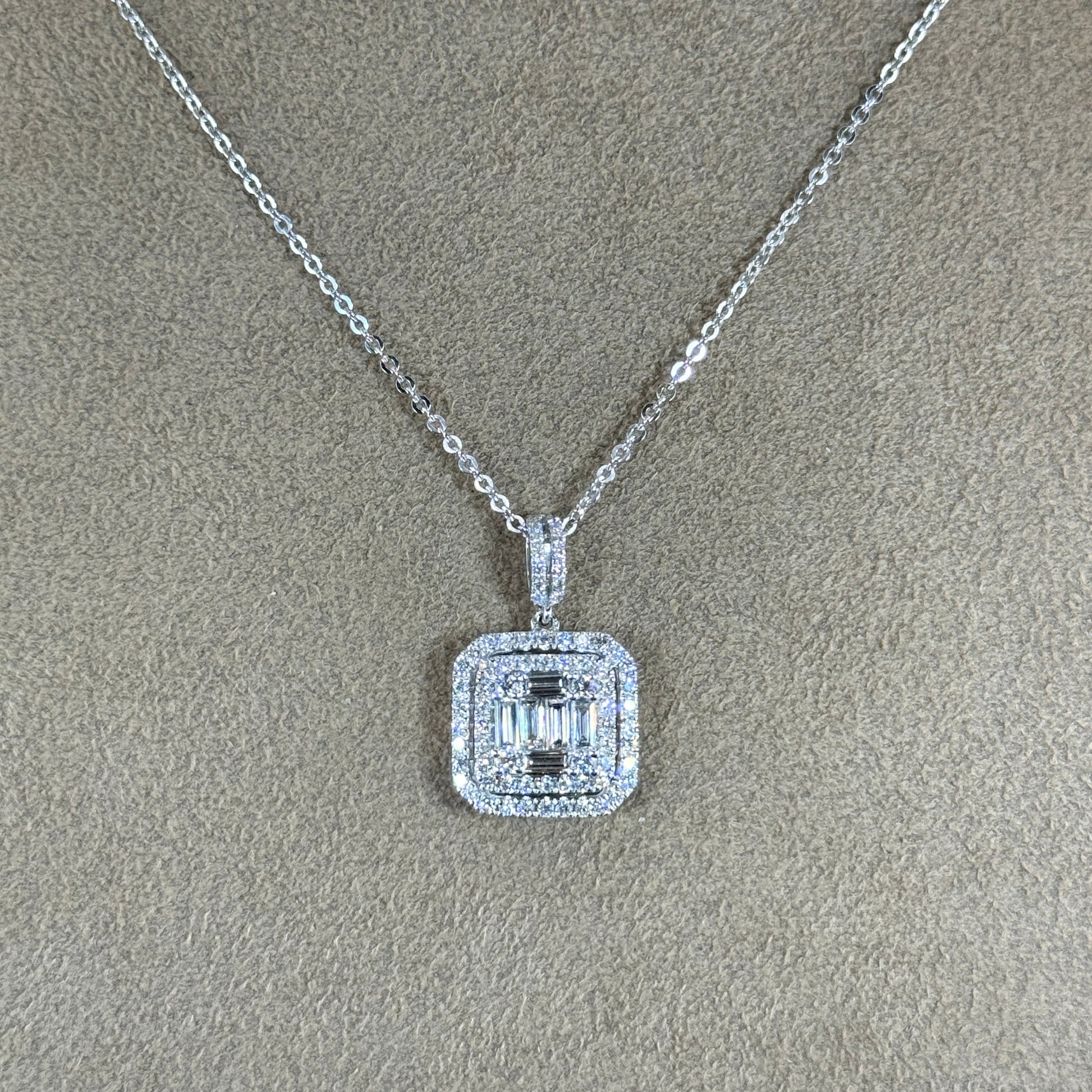 Indulge in the luxury of this 14KT Gold Baguette and Round Diamond Pendant Necklace. Featuring 6 exquisite baguette diamonds weighing 0.40cts and 74 round diamonds weighing 0.55ct in E-F VS, this necklace is truly a work of art. Elevate any outfit with its elegant and exclusive design.