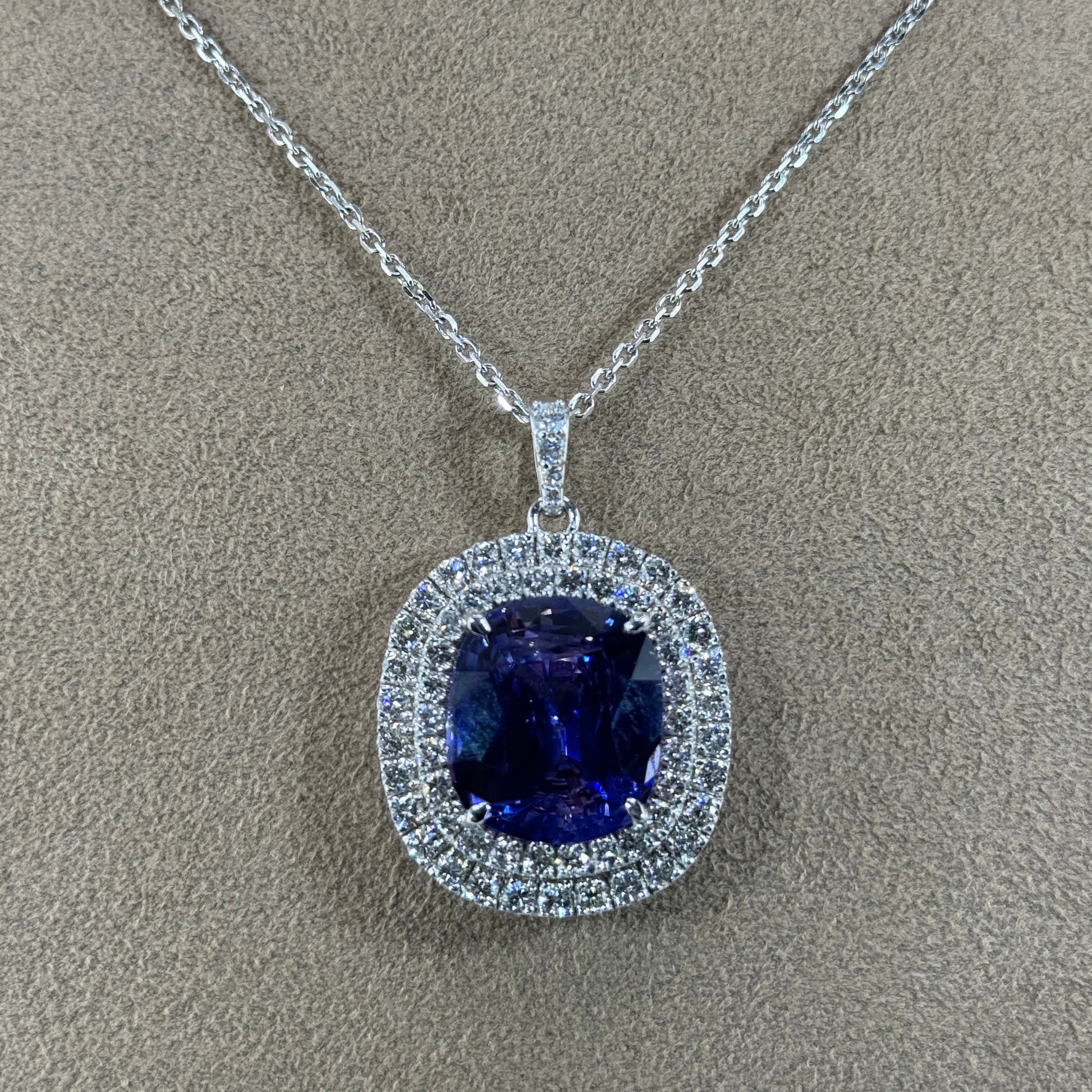 Indulge in luxury with our 14KT Gold Cushion Cut Blue Sapphire and Diamond Pendant Necklace. The captivating 22.43cts cushion cut blue sapphire is encircled by a double halo of 2.82cts E-F VS diamonds, all set in 14KT gold. GIA certified for quality and class. Elevate your style with this exclusive piece.