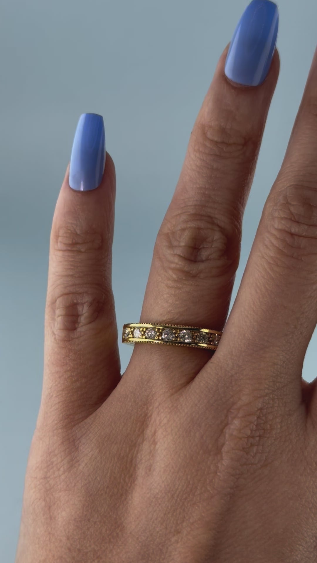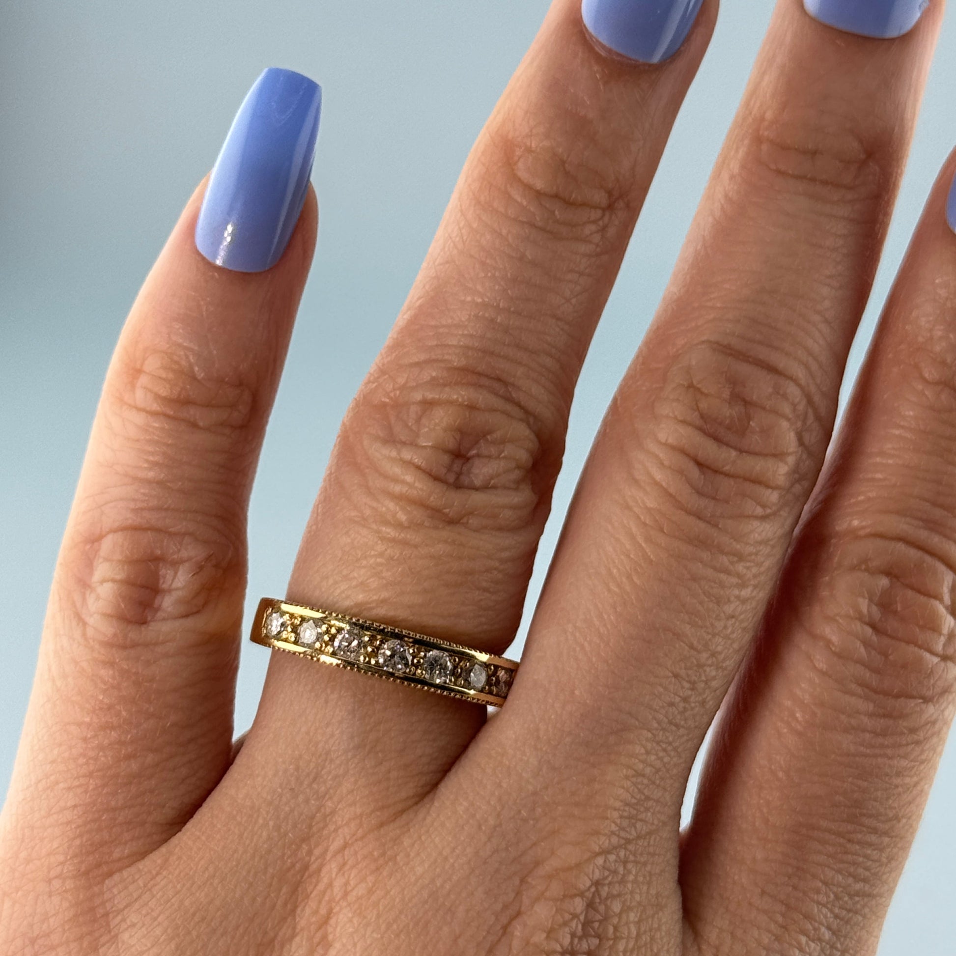 Indulge in the luxury of our 14KT Gold Diamond Band. Handcrafted with 0.32cts of sparkling, E-F color diamonds with VS clarity, this band exudes elegance and sophistication. Add a touch of glamour to any look with this exquisite piece.