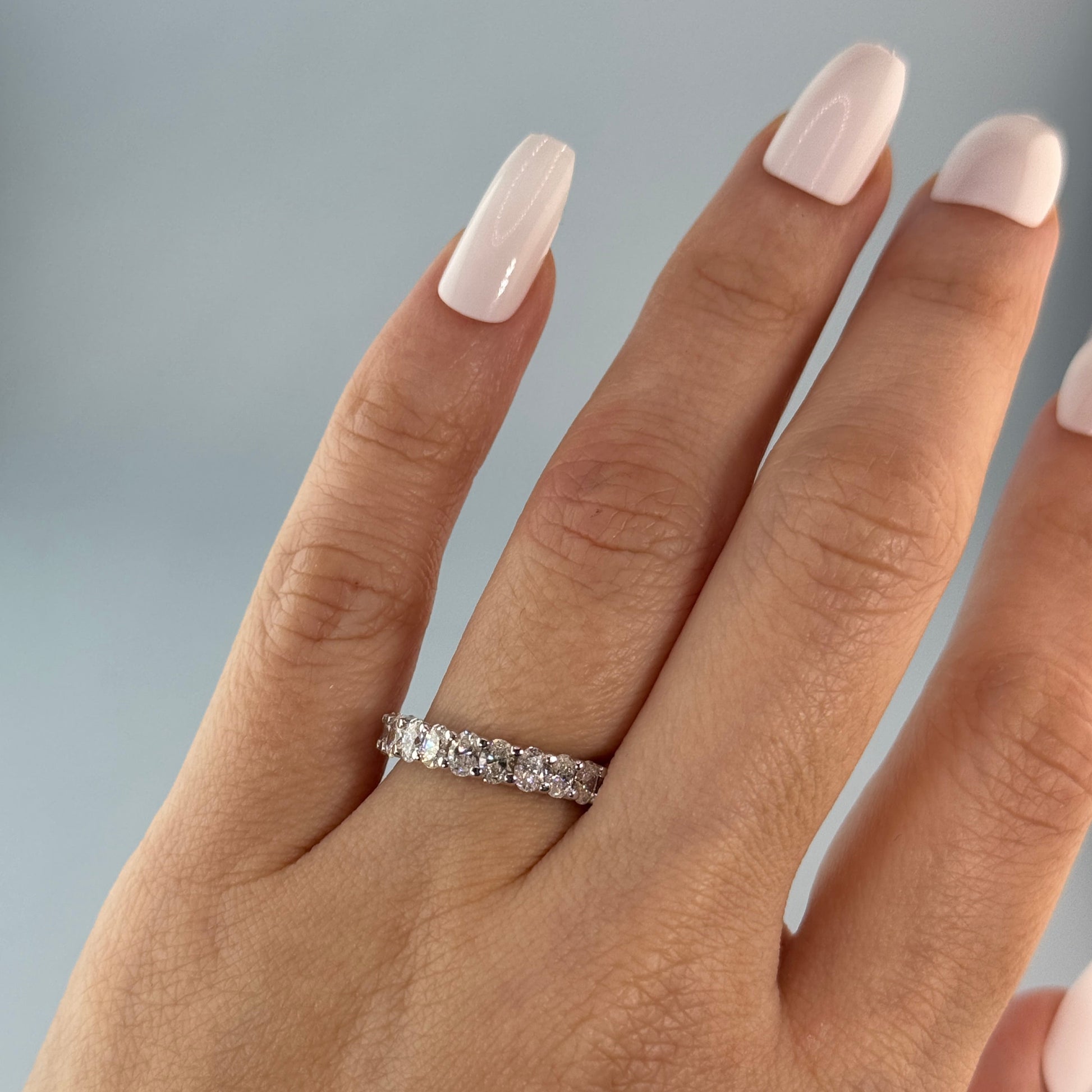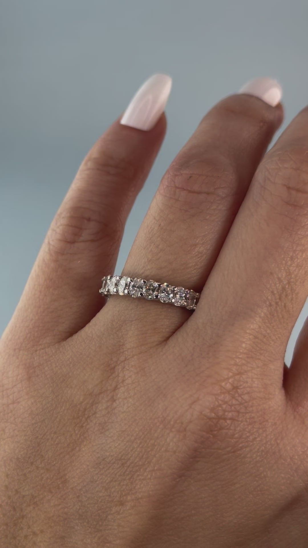 Indulge in luxury with our 18KT Gold Oval Eternity Ring. Crafted with E-F VS quality 2.28 carats of sparkling diamonds, this ring is a timeless symbol of everlasting love. Its oval shape adds elegance and sophistication, making it a perfect choice for any occasion. Elevate your style and express your love with this exclusive piece.