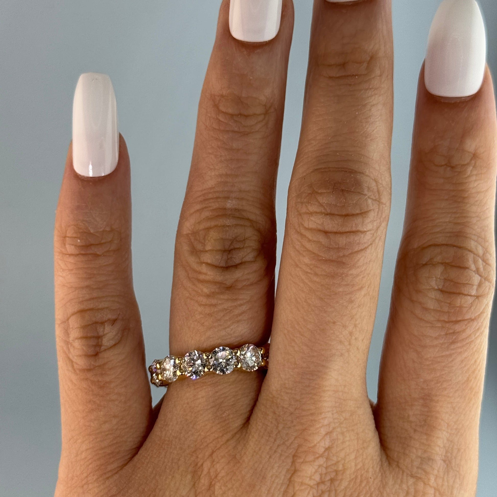 Indulge in timeless luxury with our 14KT Gold Lab Diamond Eternity Band. Crafted with 4.73cts of lab-grown diamonds set in a 14KT gold band, this piece exudes effortless elegance. Add a touch of sophistication to any ensemble with this exquisite eternity band.