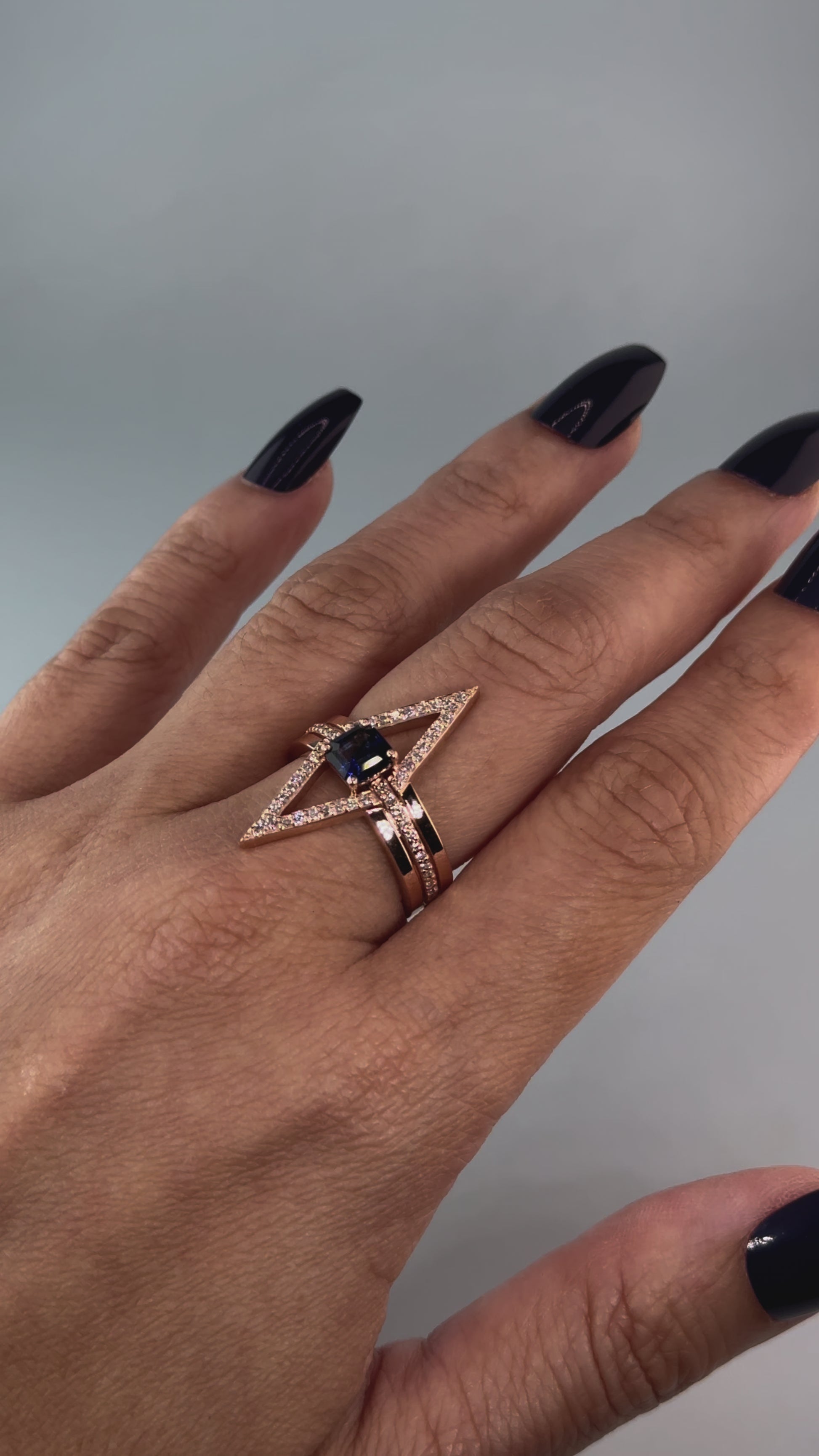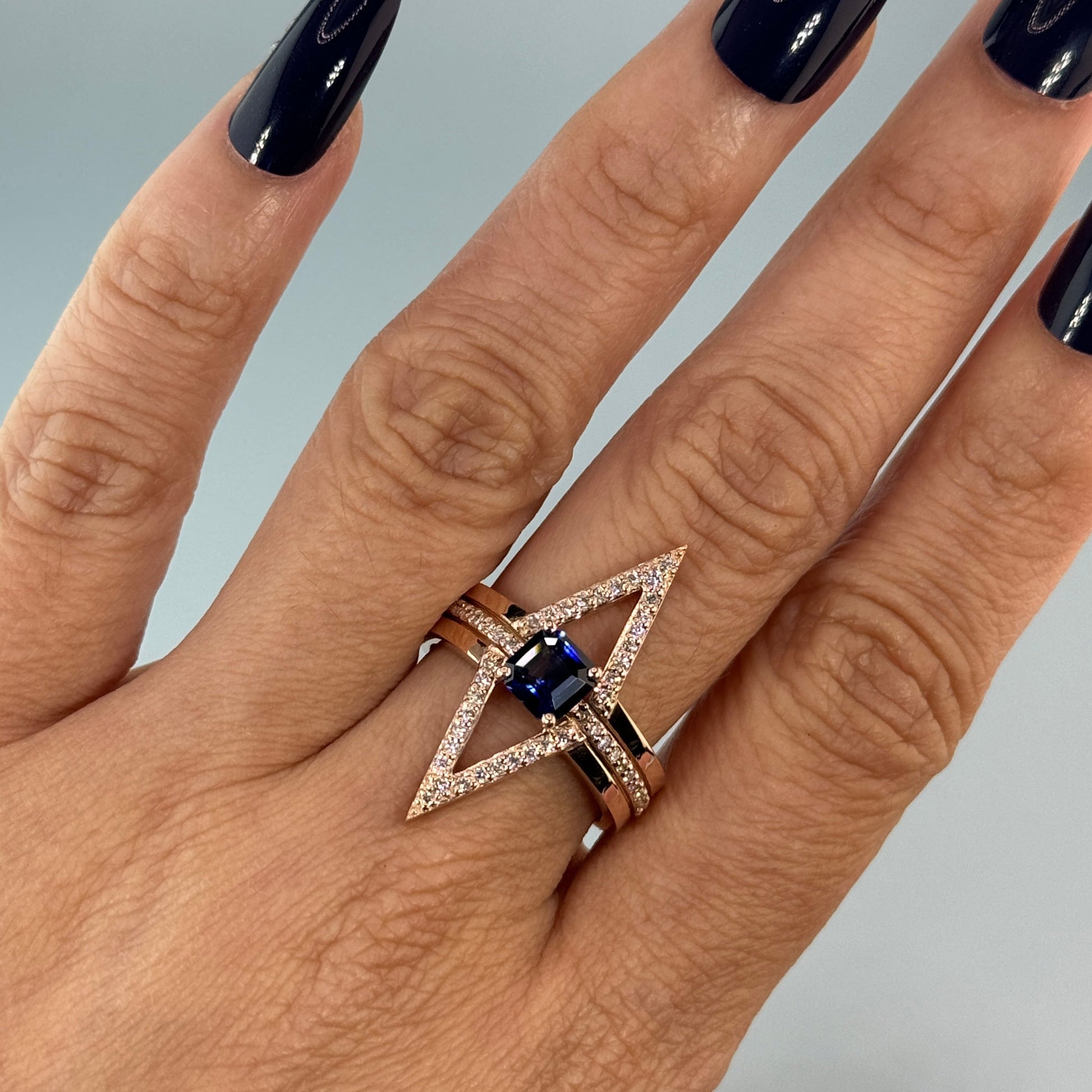 Elevate your style with our luxurious 14KT Gold North-South Blue Sapphire and Diamond Ring. The stunning 1ct blue sapphire and E-F VS .04ct diamonds are set in a north-south orientation, creating a unique and elegant look. Feel exclusive and sophisticated with this high-end piece.