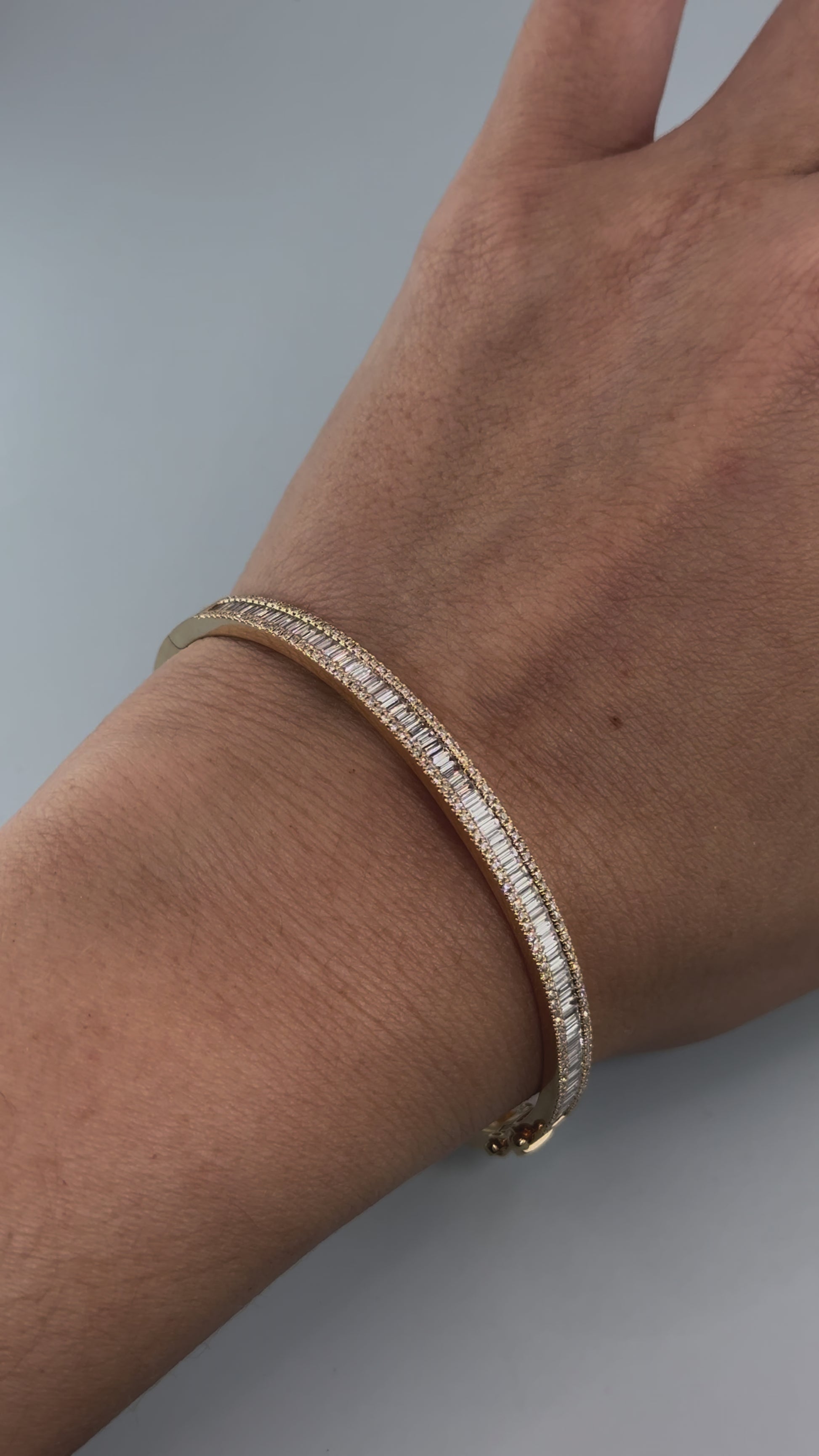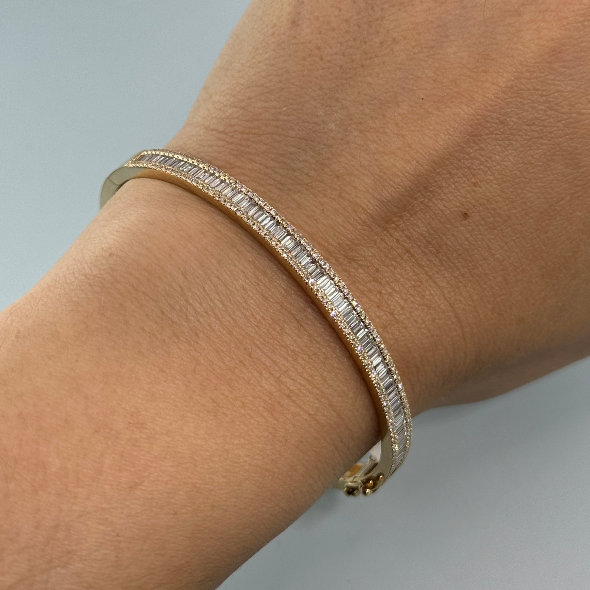 This beautiful 14K gold bangle is delicately adorned with 1.15cts of sparkling baguette and 0.43cts of round diamonds. Enhance any outfit with its timeless and elegant design. Perfect for any occasion, this bangle is sure to make a statement. This bangle weighs 11.89 grams.