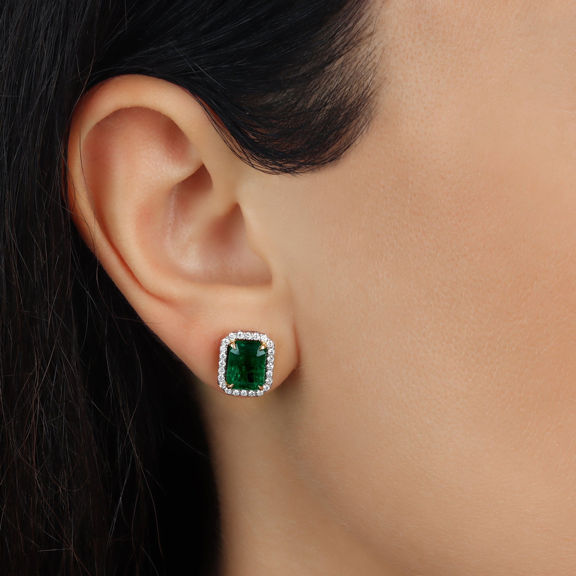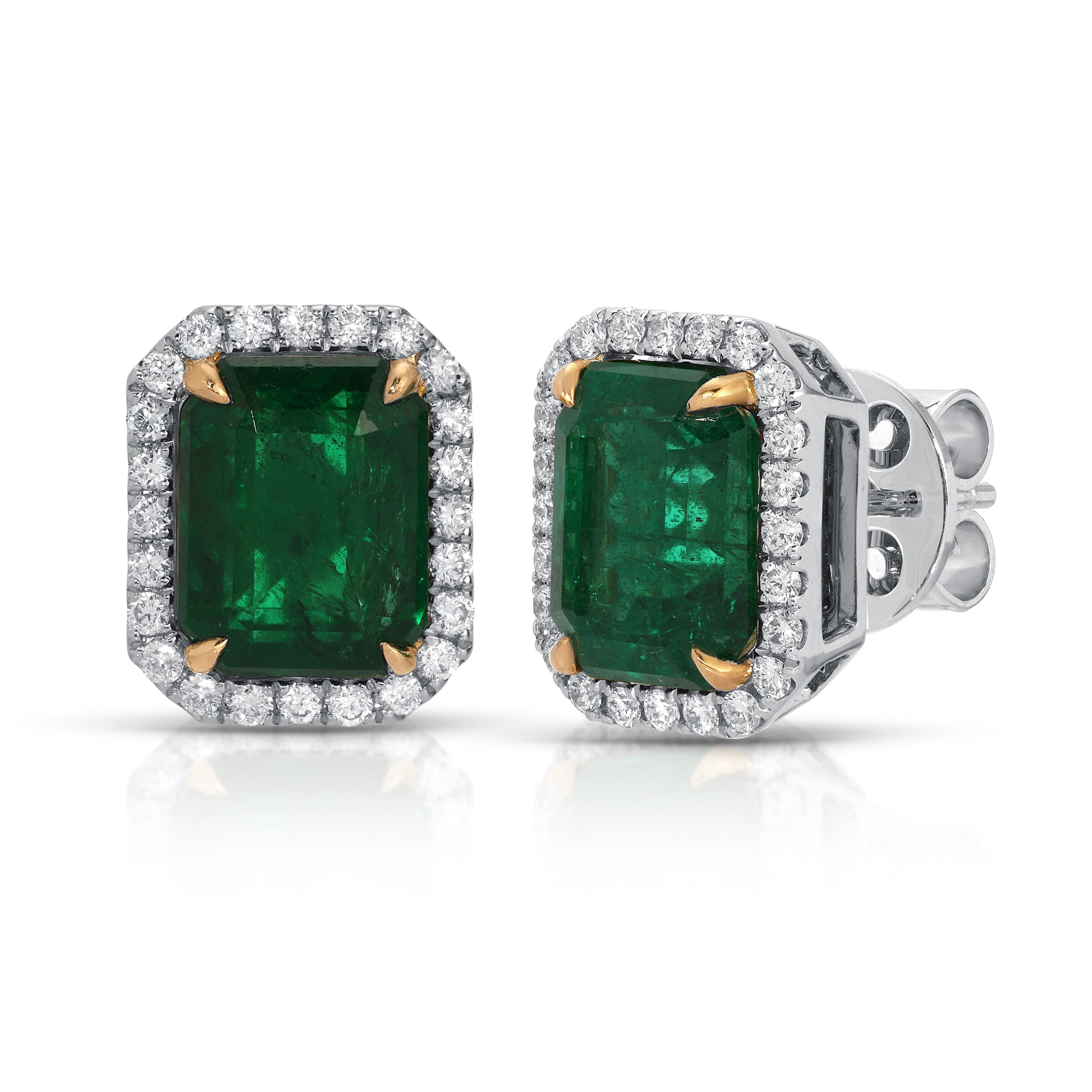 Indulge in luxury with our 18KT white and yellow gold earrings. The exquisite emeralds, totaling 5.24cts, are surrounded by 0.43ct diamonds, each carefully set in yellow gold prongs. Elevate your style with these elegant and exclusive earrings.