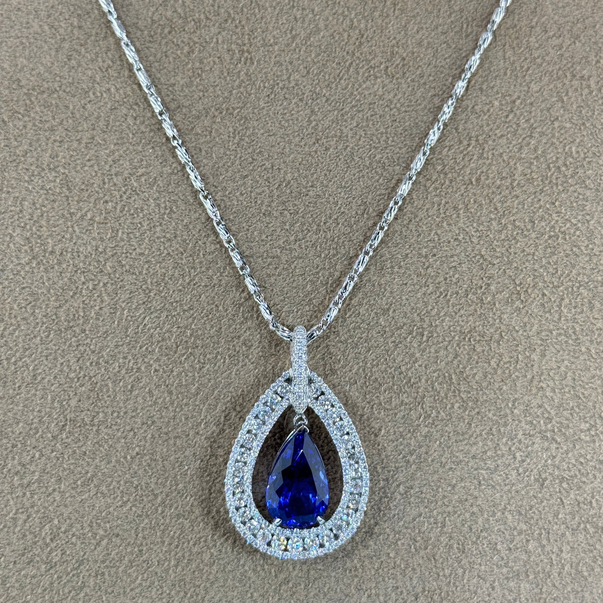 Indulge in luxury with this 18KT Gold Pear Tanzanite and Diamond Pendant Necklace. Dazzling 5.11cts pear-shaped Tanzanite combines with 1.51cts of E-F VS diamonds, creating a stunning piece that will elevate any outfit. With a sophisticated and exclusive tone, this necklace is a must-have for those with a taste for the finer things in life.
