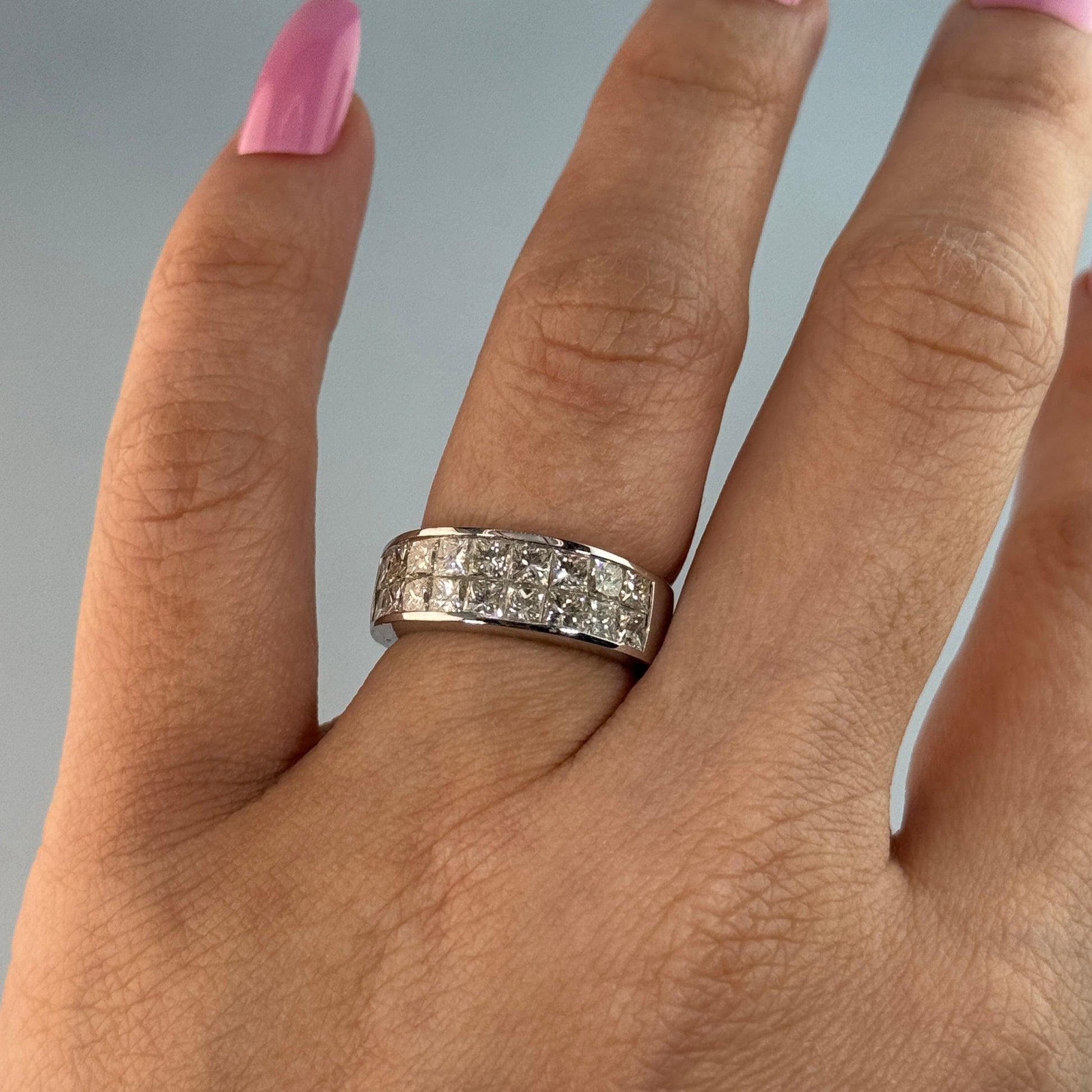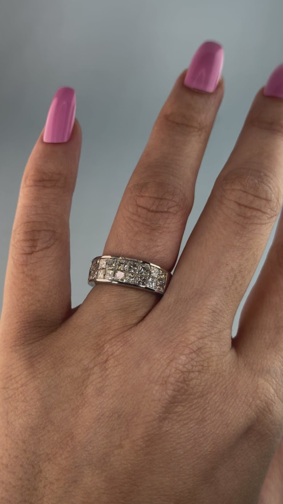 Indulge in luxury with our 18KT Gold Princess Cut Diamond Band. Crafted with 2.35 cts of dazzling E-F color, VS clarity princess cut diamonds, this band will elevate any look. The invisible setting adds to the exclusivity of this piece, making it a must-have for any jewelry collection.