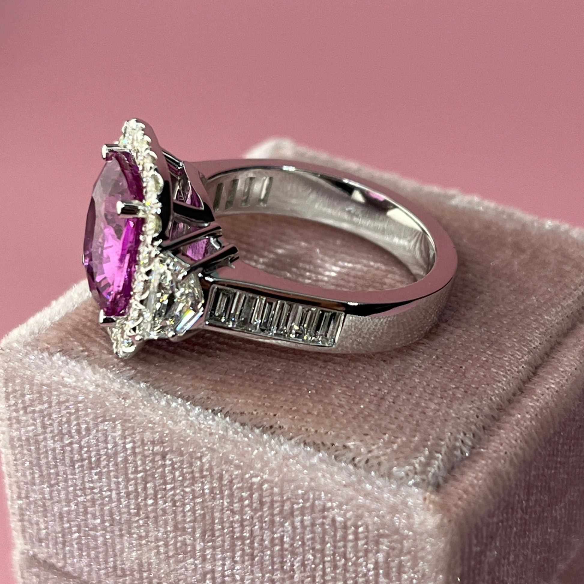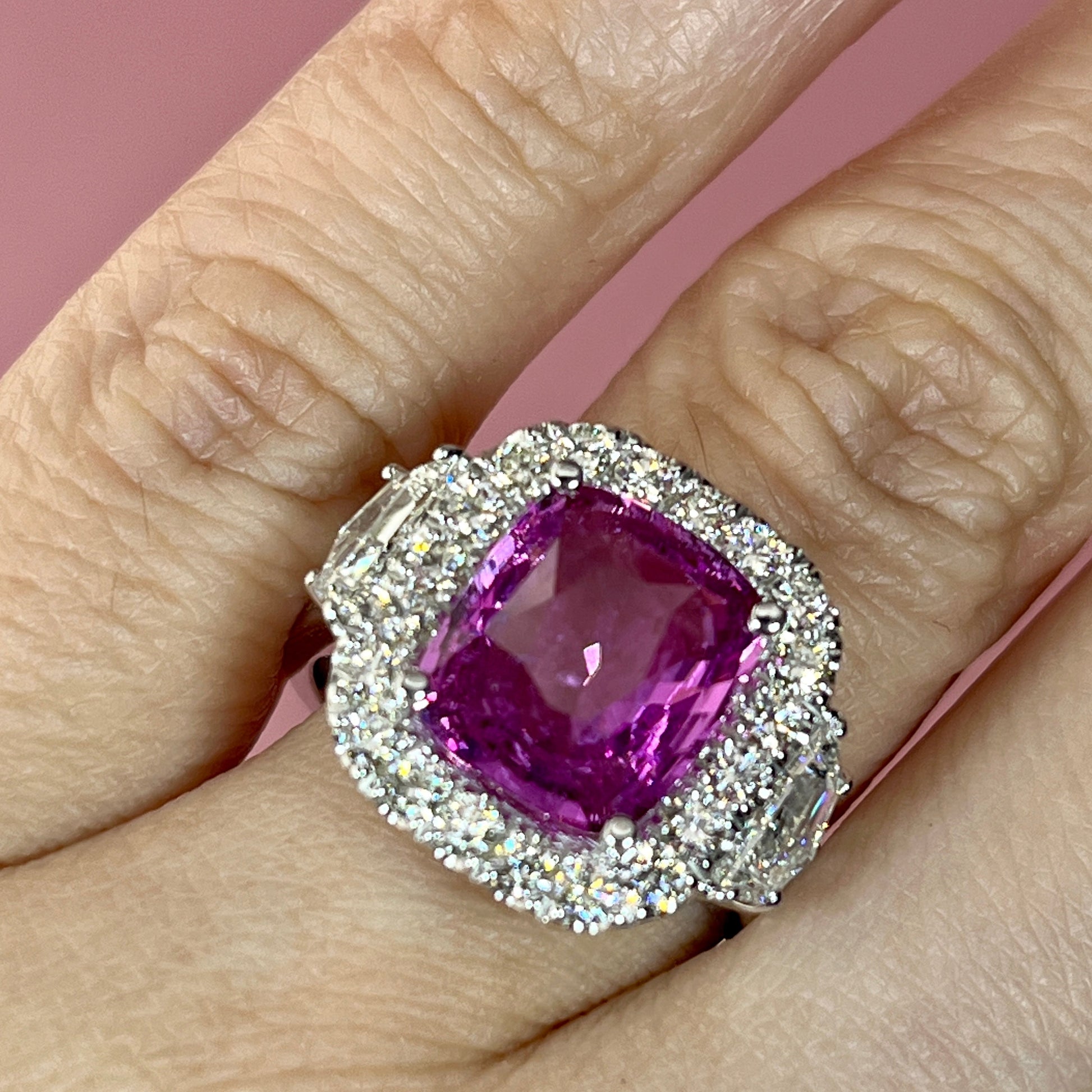 This beautiful ring features a 5.06cts. cushion cut Pink Sapphire center stone, set with F color VS quality 1ct. total weight of 2 Cadillac cut diamonds, a total weight of 0.85ct. baguette cut diamonds, and a total weight of 0.75ct. of round diamonds in a 14K white gold ring setting.
