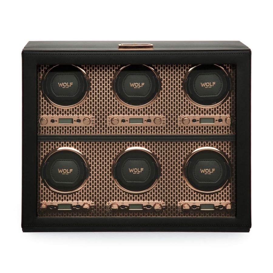 Powder-coated or copper-plated laser cut perforated steel melded with clean, sleek lines. The Axis collection drives a modern, bold look for safekeeping your timepieces. Our patented technology of counting rotations of the axis of your watch guarantees precise Turns Per Day.